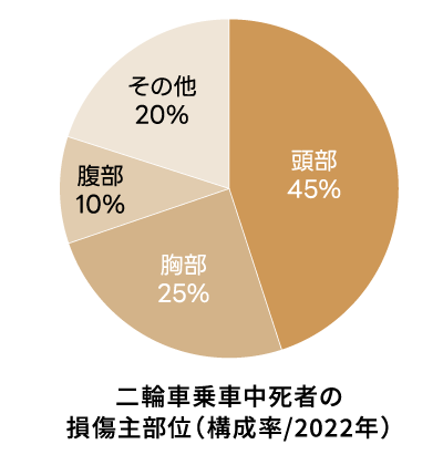 警視庁の2022年の調査によると、二輪車乗車中の事故死者の損傷主部位は、頭部に次いで多いのが胸部という結果になっています。